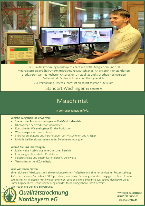Als wachsendes Unternehmen sind wir stets auf der Suche nach neuen Talenten für unser Team! Hier finden Sie alle offenen Stellen in unserer Qualitätstrocknung Nordbayern eG und unserer Tochterfirma, der WB Qualitätsfutterwerk GmbH. Wir freuen uns darauf Sie kennenzulernen!